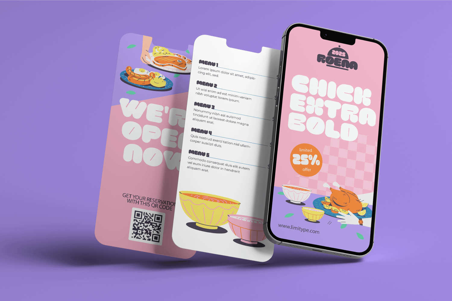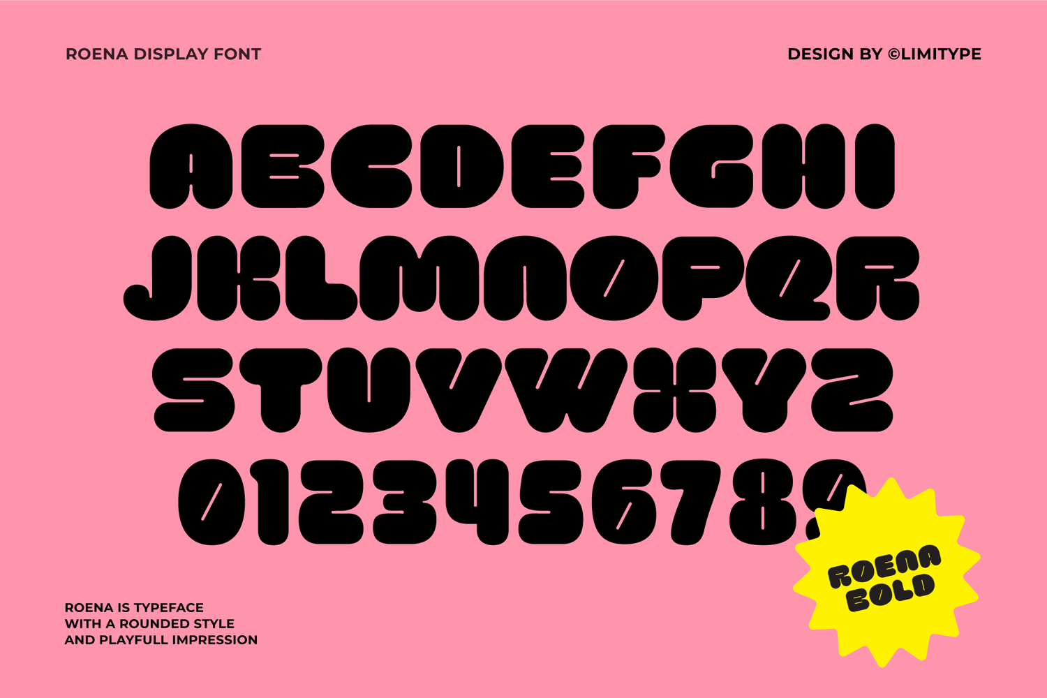 Roena is a font with a bold, cheerful, and expressive style designed to bring a fun vibe to every design. Its unique, rounded, and daring letterforms make it perfect for kids’ event posters, food & beverage packaging, creative branding, social media content, and even titles or headers that need to stand out and feel playful.